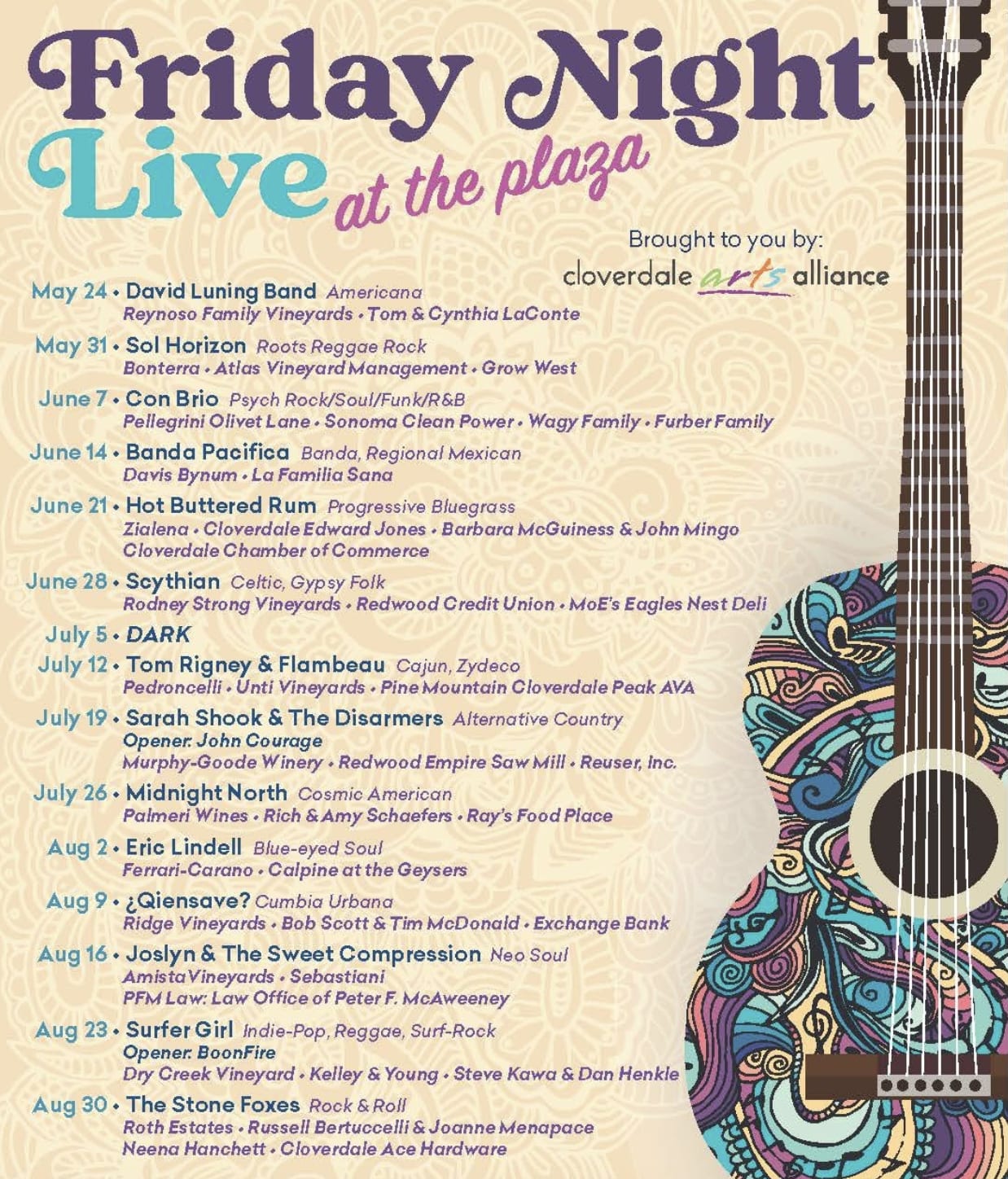 Friday Night Live at the Plaza, Cloverdale’s free summer concert series, has announced the lineup of bands scheduled to appear Friday nights from May 24 – August 30, 2024. Friday Night Live, produced by the Cloverdale Arts Alliance, will offer a variety of family-friendly activities every Friday evening throughout the summer. Downtown Cloverdale comes alive with Friday Night Live at the Plaza. In addition to high-caliber, party and dance bands, FNL visitors will find many other attractions. Dinner is available from a variety of food vendors and nearby restaurants, and premium Sonoma County wines and craft beers can be purchased by the glass. Hand-crafted arts, crafts and other unique, locally made items are available, along with a variety of kids’ activities. The Street Fair opens at 6:00 PM and live music runs 7:00-9:30 PM. Audiences are sure to experience the best of small-town America and free family-friendly, dance and party concerts at Friday Night Live at the Plaza in downtown Cloverdale all summer long.