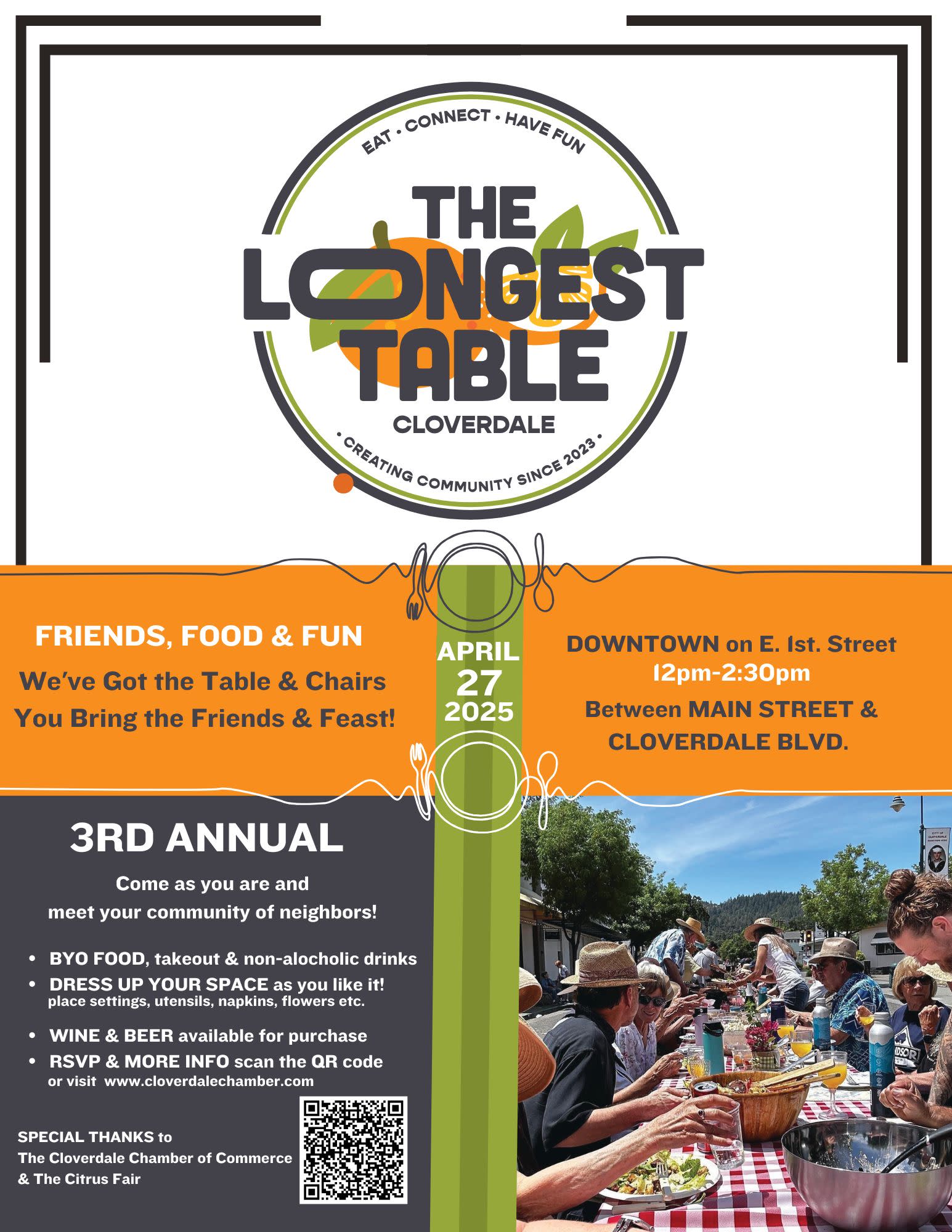 SAVE THE DATE!!! Join us for the Cloverdale Chamber's 3rd Annual Longest Table event. Where community, good food, and great company come together in the heart of our town! We will close down First Street and set up one incredible, extra-long table for EVERYONE to enjoy. Whether you're flying solo or bringing a crew, this is the perfect chance to connect with your neighbors in a relaxed, welcoming setting.